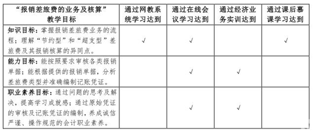 首先,引导学生在学校网教系统完成本周教学内容的预习,学生通过自主学习掌握基础知识点。其次,结合学生预习情况的调查结果,在会议授课阶段对重难点进行精讲突破。再次,组织学生在实操平台开展业务实训,实现能力的提升和职业素养的锻炼,如在差旅费业务实训中学生通过报销单据的审核提高了专业审核能力,培养了严谨细致、操作规范的工作习惯。最后,选取中国大学MOOC上适用的课程资源帮助课后复习,巩固新知。