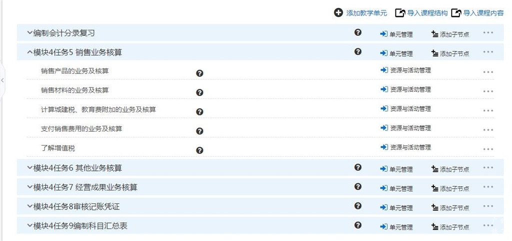 首先,在学校得实平台搭建课程架构。由一个复习任务和五个新任务构成,每个任务下分设小节,添加相配套的课件、讨论与作业。学生根据老师指引,在得实网教系统开展自主学习,进行课前预习、课中活动参与及课后复习,并完成作业的线上提交。