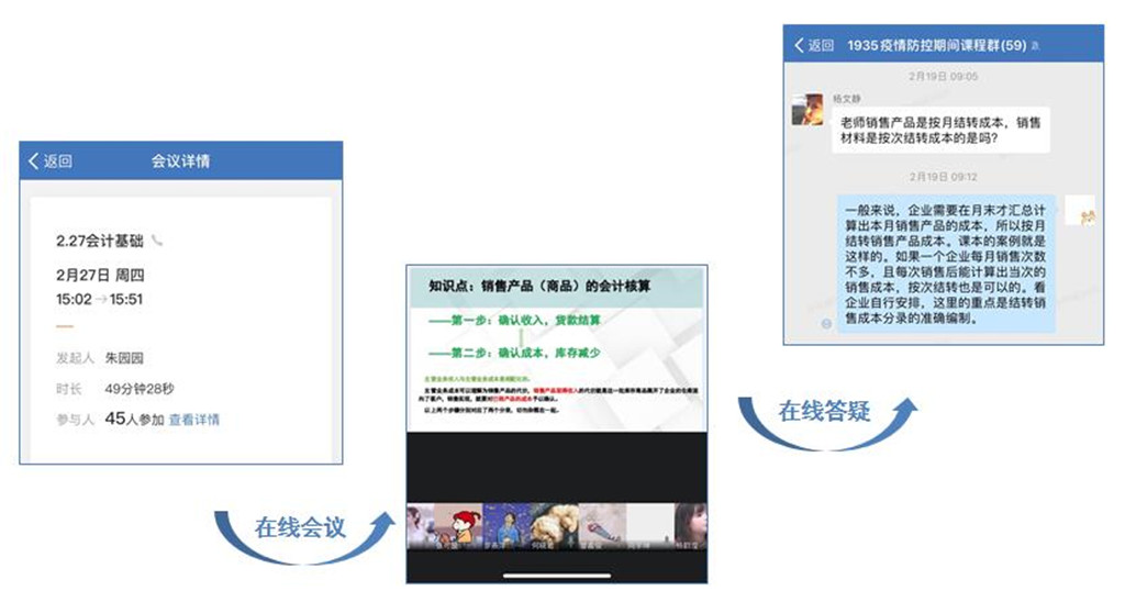 其次,在企业微信开展在线授课会议与答疑。老师通过企业微信,对学生发起会议邀请,在课表时间段进行新课讲解与作业评讲。在会议中,利用文件演示功能,呈现课件、图片、文档等资料开展讲解;利用标注功能进行对需要注意的知识点进行标识;会议中,适时提问学生,检测他们的学习状态与成效。此外,老师在各班的答疑群中进行在线答疑,一位同学提出问题,其他同学也可以看到老师的回答。