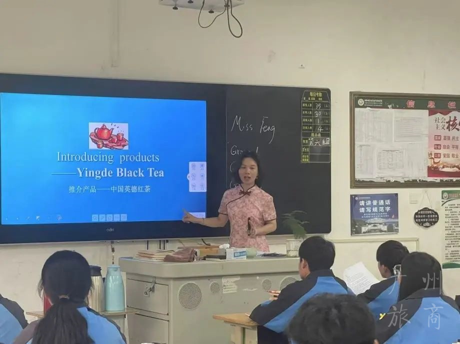 在同课异构教学展示环节中,冯静老师带来《Introducing Products--Yingde Black Tea》示范课,构建了“语言赋能+技能培育”的立体化教学场景,为课堂注入鲜活的专业活力。课堂上,冯老师创新采用“游戏化输入+场景化输出”的教学模式:通过趣味互动游戏引导学生掌握产品推介核心词汇与句型;将英语表达融入红茶冲泡实操——学生们在温杯、投茶、出汤的过程中,能用“rich amber color,with a hint of caramel aroma”等英文描述茶汤色泽与香气,实现了语言运用与技能操作的有机统一。