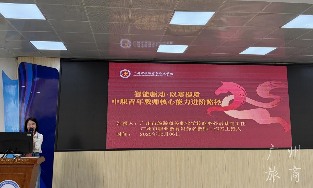 在主题分享环节,广州市职业教育冯静名教师工作室主持人、广州市旅游商务职业学校商务外语系副主任冯静,以“智能驱动・以赛提质:中职青年教师核心能力进阶路径”为题展开深度分享。作为多次斩获省级教学能力竞赛大奖的专家型教师,冯静老师结合《国家职业教育改革实施方案》等政策要求,提出“政策与技术双轮驱动是智能教育发展必然”的观点,强调中职教学需以“岗课赛证融合”为核心,破解“实操风险高、设备不足、技能与岗位脱节”等痛点。她分享的“具身认知+跨学科融合+教师绝活+智能技术=岗位核心能力”教学设计公式,以及“企业调研定需求、绝活匹配强特色、智能赋能提实效”的实施路径,为现场教师提供了可复制的实践方案,干货满满的内容赢得阵阵掌声。