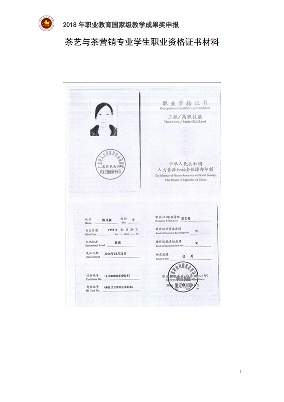 4-3-5 茶专业学生职业资格证书证明材料扫描件