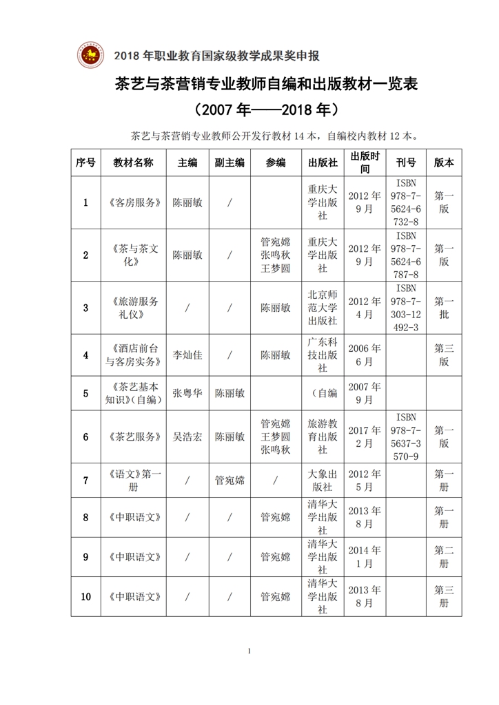 3-1-16 茶艺与茶营销专业教师自编和出版教材一览表