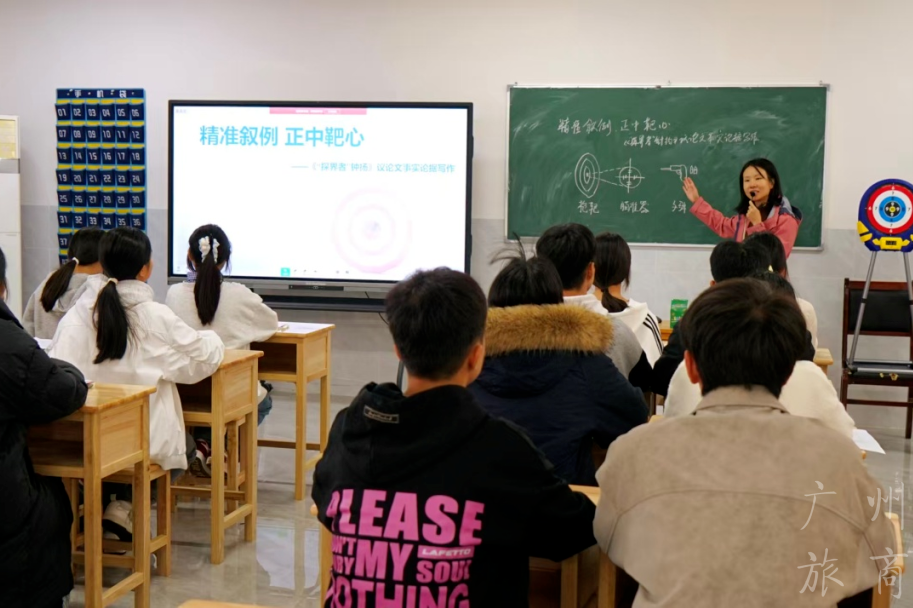孙红名师工作室成员钟茵倩老师以精心设计的公开课《精准叙例,正中靶心——〈“探界者”钟扬〉议论文事实论据写作》,为现场师生呈现了一堂精彩的议论文写作课。她通过趣味“射击游戏”导入课堂,运用“AI深度学伴”实现个性化指导,引导学生从简单罗列事例到精准论证观点,有效提升了学生的逻辑思维与书面表达能力。